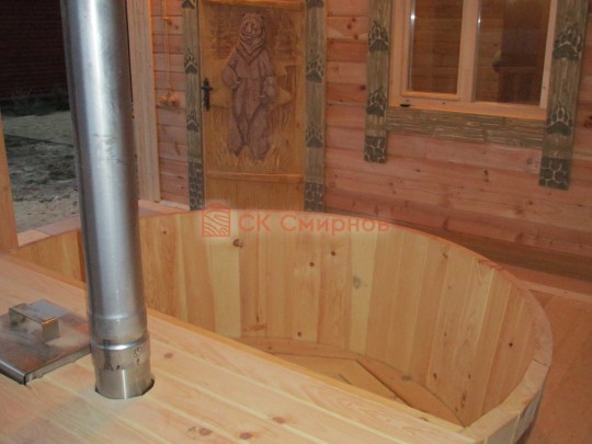 Купель расчитана на 3-4 человека. Оснащена погружной печью и тентом. Нагревается за 3 часа, остывает примерно 5 часов.