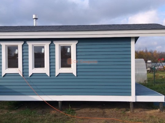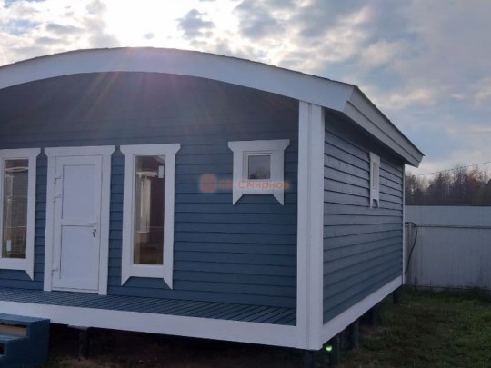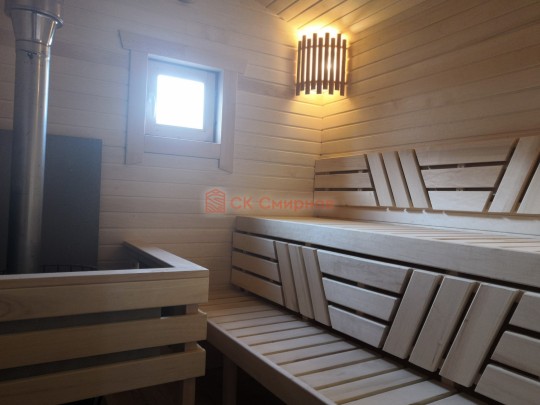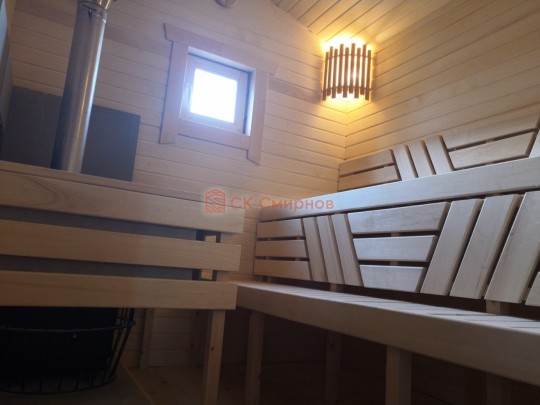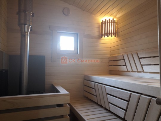 Для строительства этой красивой каркасной бани 5х6 метров СК Смирнов разработал авторский проект №217 с обустроенной парной из алтайского кедра и комнатой отдыха. По планировке общая площадь составляет 32 квадратных метра — есть сауна и просторная жилая комната с впечатляющими панорамными окнами во всю стену.