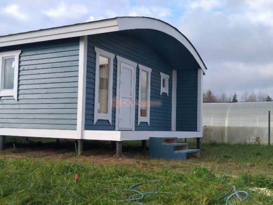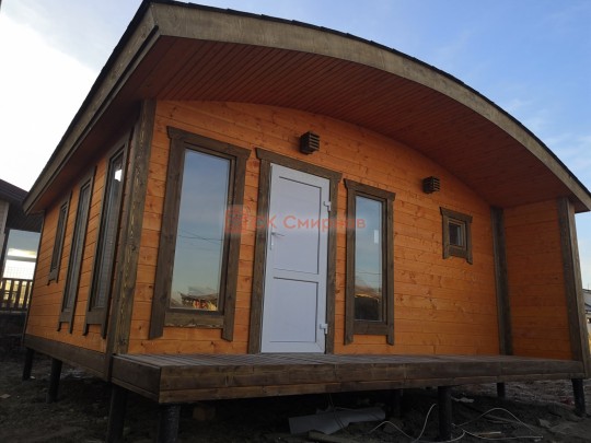 Можно выделить несколько особенностей проекта: терраса, округлая крыша, панорамные стеклопакеты, скамейки с откидными крышками, электропроводка, дизайнерская люстра. Мы строим бани-дома каркасной сборки с утеплением под ключ с полной отделкой снаружи и внутри.