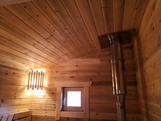 Кедровая вагонка в парной, спинки над пологами и декоративная решётка между пологами. Дверь крашеный усиленный стеклопакет (снаружи RAL 8017, изнутри «Жёлтый»);