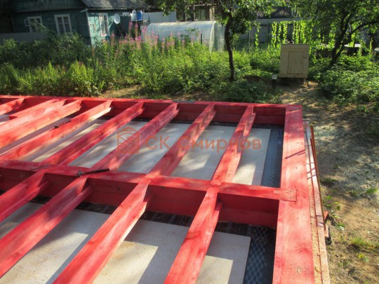 Лаги, обвязку и черновой пол обрабатываем раствором био огне защитой ( зимой оговариваются отдельные условия ), в основном красный цвет, но может быть и бесцветная обработка.