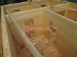 Из 9х14см, 14х14 см или 14х19 см. Сборка сруба в теплый угол на нагеля или гвозди 200 мм со сверлением отверстия в верхнем брусе (в зависимости от вида бруса).