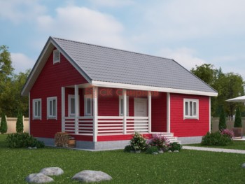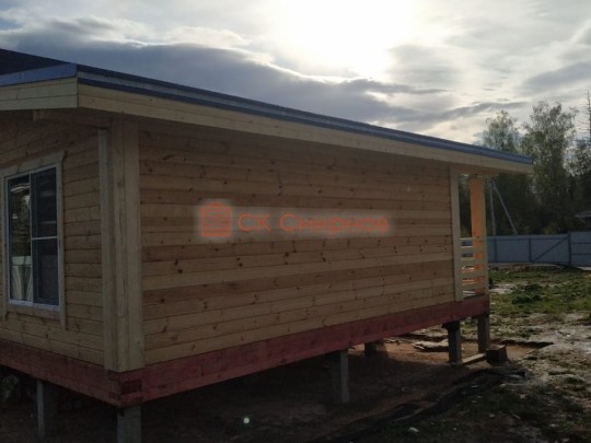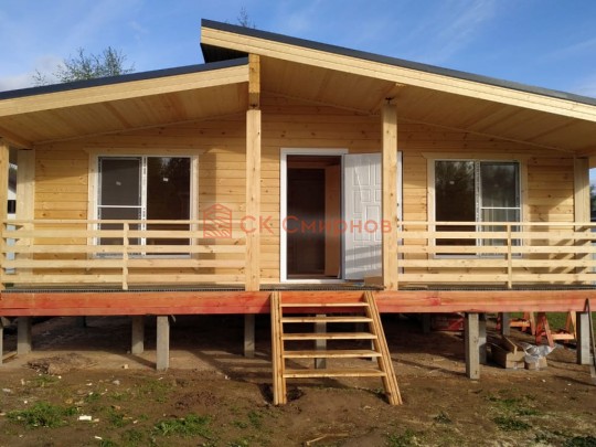 В мае 2020 мы завершили строительство дачного дома из бруса 7 на 9 метров по современному проекту с разноуровневой двускатной крышей. Дом небольшой, но планировка продумана хорошо. На 63 квадратных метрах поместились тамбур, прихожая, две спальни, кухня-гостиная и санузел. Есть большая открытая терраса. Ничего лишнего — все помещения функциональны и неизбыточны.
