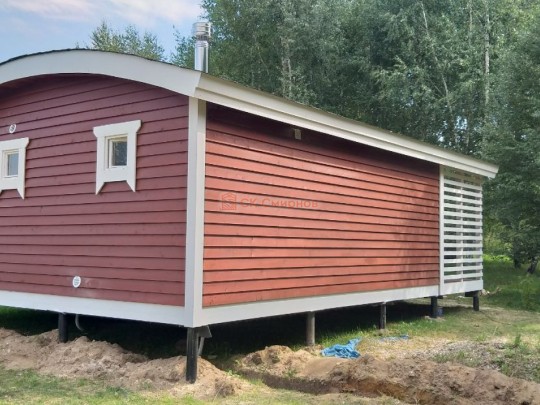 Бани подобного типа мы строим как по каркасной технологии с утеплением и обшивкой доской внахлёст, так и из клееного или сухого бруса. В обоих случаях качество сборки превосходное: баня тёплая, надёжная и очень красивая.