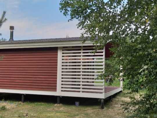 Используется сухая, строганная доска 19х140 доска, покрашенная до сборки, что предотвращает появление полос не прокрашенных после высыхания древесины полностью.